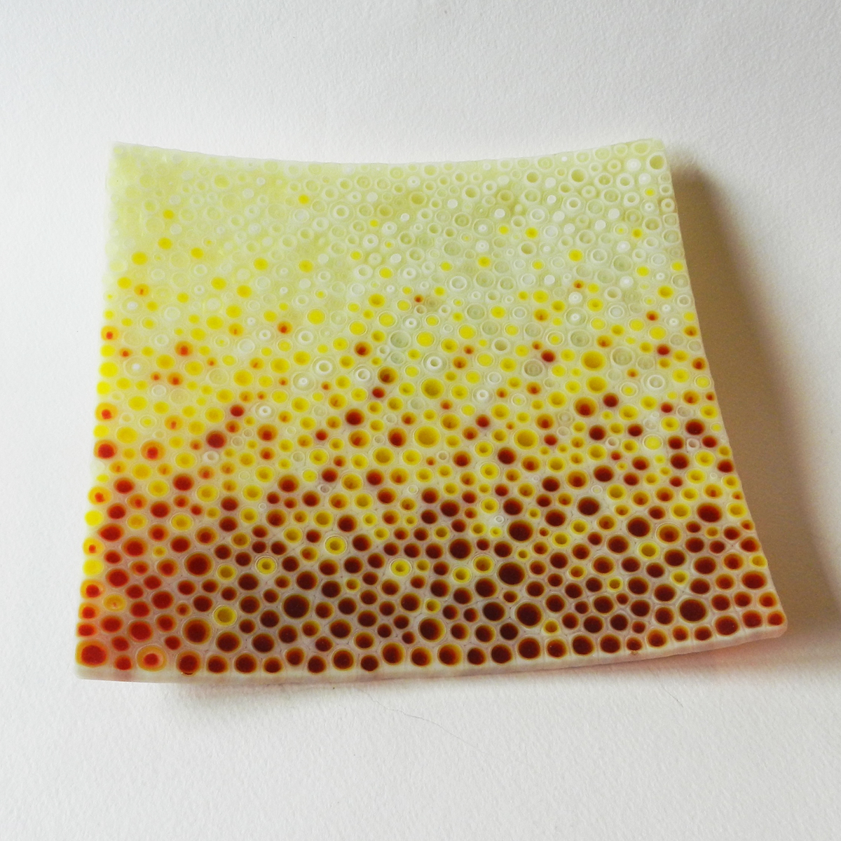 My pieces begin as a mass of molten glass pulled into long thin rods. These rods contain a series of concentric circles in colors initially layered together and can only be seen when sniped into a bit and turned on end. Hundreds, sometimes thousands, of these cross sections are individually arranged on a kiln shelf then fired to become a single surface. No two will ever be identical. Each piece is extensively cold worked for a satin finish and fired again for the final shaping.
