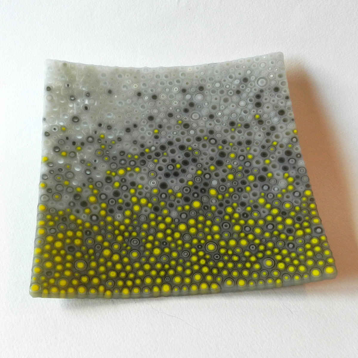 My pieces begin as a mass of molten glass pulled into long thin rods. These rods contain a series of concentric circles in colors initially layered together and can only be seen when sniped into a bit and turned on end. Hundreds, sometimes thousands, of these cross sections are individually arranged on a kiln shelf then fired to become a single surface. No two will ever be identical. Each piece is extensively cold worked for a satin finish and fired again for the final shaping.