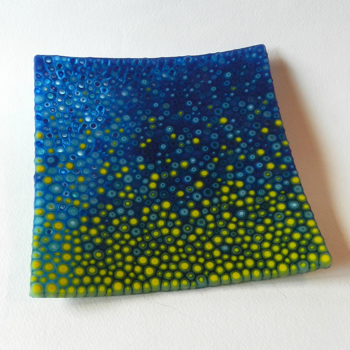 My pieces begin as a mass of molten glass pulled into long thin rods. These rods contain a series of concentric circles in colors initially layered together and can only be seen when sniped into a bit and turned on end. Hundreds, sometimes thousands, of these cross sections are individually arranged on a kiln shelf then fired to become a single surface. No two will ever be identical. Each piece is extensively cold worked for a satin finish and fired again for the final shaping.