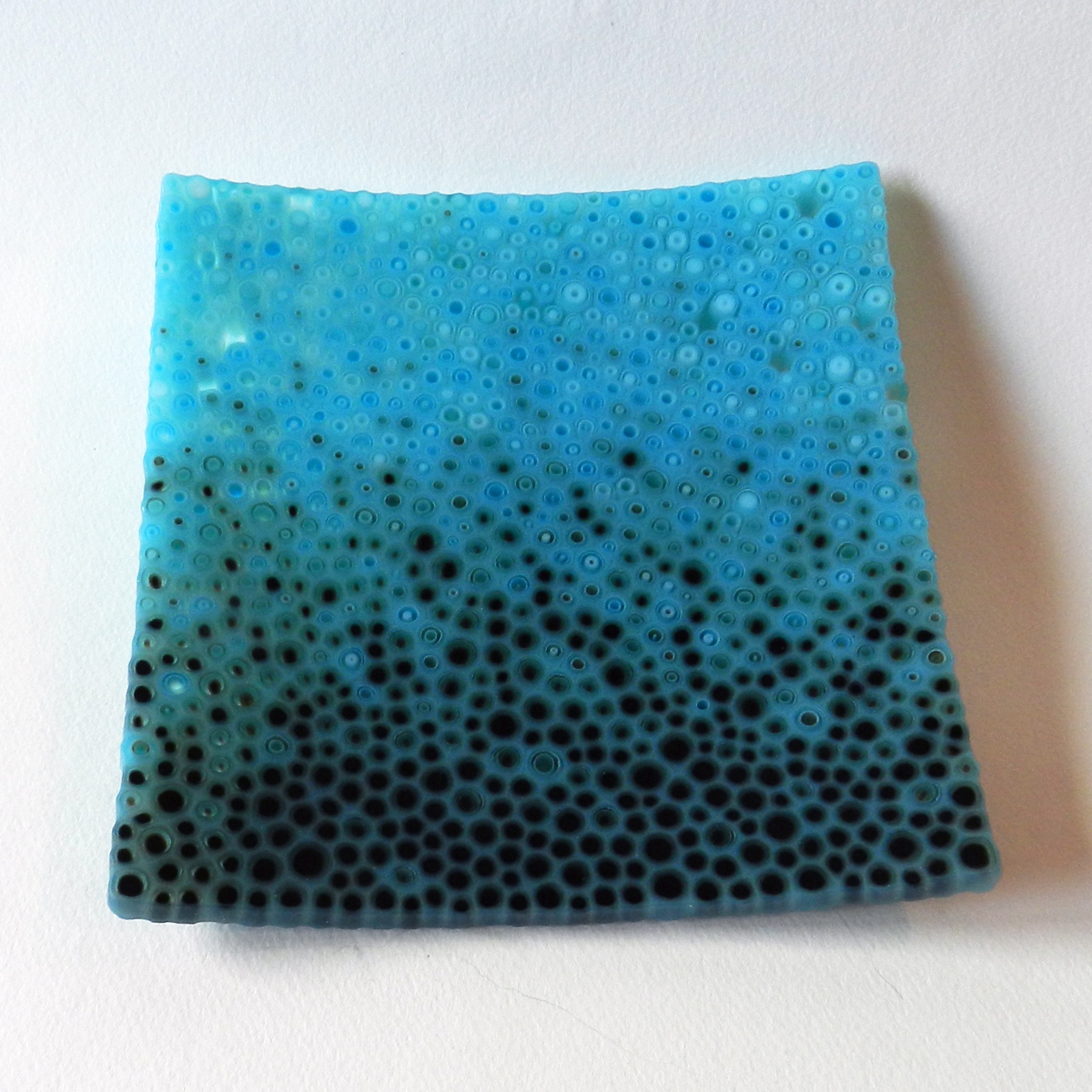 My pieces begin as a mass of molten glass pulled into long thin rods. These rods contain a series of concentric circles in colors initially layered together and can only be seen when sniped into a bit and turned on end. Hundreds, sometimes thousands, of these cross sections are individually arranged on a kiln shelf then fired to become a single surface. No two will ever be identical. Each piece is extensively cold worked for a satin finish and fired again for the final shaping.