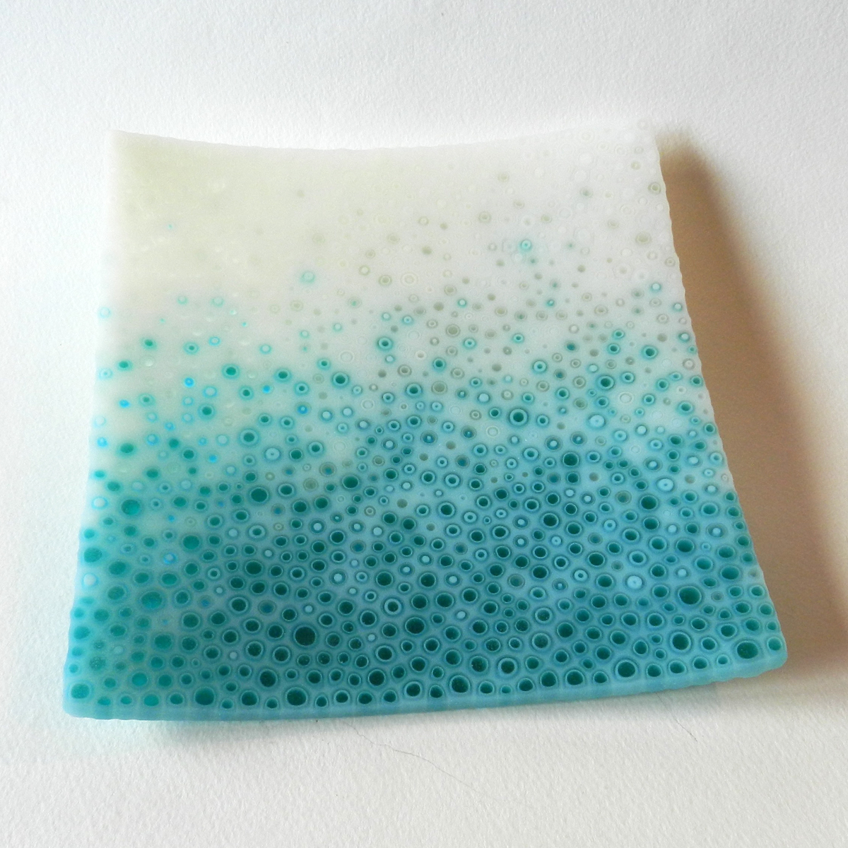 My pieces begin as a mass of molten glass pulled into long thin rods. These rods contain a series of concentric circles in colors initially layered together and can only be seen when sniped into a bit and turned on end. Hundreds, sometimes thousands, of these cross sections are individually arranged on a kiln shelf then fired to become a single surface. No two will ever be identical. Each piece is extensively cold worked for a satin finish and fired again for the final shaping.